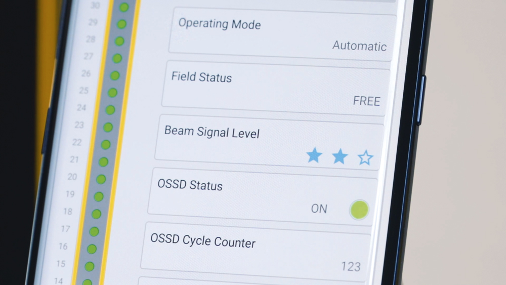 Praktisch bei diesem System ist die integrierte Einrichthilfe, die die Inbetriebnahme der optoelektronischen Sicherheitseinrichtungen deutlich erleichtert. Die Lichtgitter bestehen aus einer Sender- und der Empfängereinheit, die zueinander ausgerichtet werden müssen. Dabei zeigt die App nicht nur die allgemeine Signalstärke an, sondern auch die Qualität jedes einzelnen Strahles. Blinkt nur ein Stern, ist die Qualität der Ausrichtung nicht ausreichend. Werden alle drei Sterne angezeigt, ist die Ausrichtung perfekt. Da zudem der Status und die Qualität jedes einzelnen Strahles in der App angezeigt wird, leuchten diese bei einer optimalen Sensorausrichtung alle grün. Sobald die App gestartet wird, listet sie alle in der Nähe verfügbaren Sicherheitslichtgitter auf. Zu jedem einzelnen Gerät werden Grunddaten angegeben, wie etwa die Seriennummer oder die Schutzfeldauflösung und die Schutzfeldhöhe des Lichtgitters. Da der Anwender die verfügbaren Lichtgitter mit individuellen Bezeichnungen versehen kann, sind die signalgebenden Geräte leicht zu identifizieren. Wichtig ist insbesondere die Anzeige des Gerätestatus: Hier kann der Anwender die Betriebsart, den Status der OSSD-Ausgänge und den Schutzfeldstatus einsehen. Zudem erhält er eine Information über die angelegte Versorgungsspannung. Auch unvorhergesehene Betriebszustände werden über die App gemeldet. Bei Auftreten eines Fehlers kann beispielsweise zur Behebung des Problems die Betriebsanleitung über die App abgerufen werden. Auch ist das eine praktische Unterstützung im betrieblichen Alltag. Wird das Schutzfeld unterbrochen, wird dies dem Nutzer in Echtzeit angezeigt. Darüber hinaus wird der Anwender über die Anzahl der Schaltzyklen informiert und kann mit diesen Angaben die Servicezyklen für die Sicherheitsrelaisbausteine planen: Mithilfe der tatsächlich angefallenen Betriebsstunden ist es möglich, die Intervalle für die wiederkehrenden Prüfungen festzulegen.