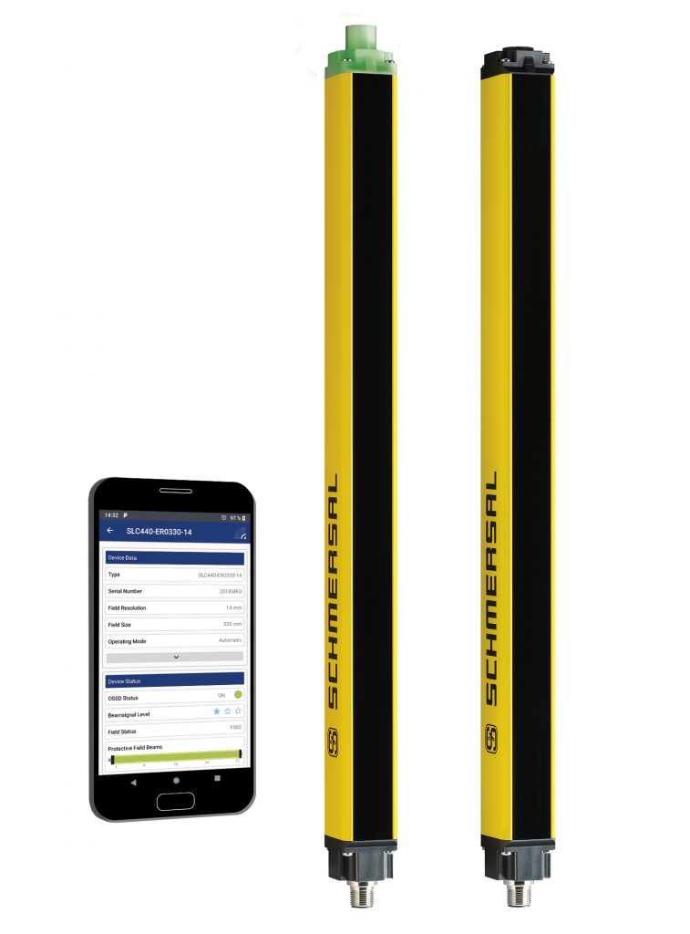 Die Vorteile von berührungslos wirkenden Schutzeinrichtungen (BWS) wie Sicherheitslichtvorhängen und Sicherheitslichtgittern liegen auf der Hand: Der Bediener hat den Arbeitsraum im Blick und man kann auf Schutztüren oder andere trennende Vorrichtungen verzichten. Durch zusätzliche Funktionen wird die optoelektronische BWS noch flexibler, z.B. kann sie Mensch und Material unterscheiden, sodass eine Unterbrechung des Materialflusses nur dann erfolgt, wenn eine Gefahrensituation entsteht. Das führt zu einer höheren Leistung und Produktivität der Anlagen. Weitere Effizienzsteigerungen bei den Fertigungsprozessen verspricht eine Sicherheitslösung, die Schmersal erstmals auf der SPS 2019 in Nürnberg vorstellt: ein neues optoelektronisches Sicherheitssystem mit BLE-Interface. BLE steht für Bluetooth Low Energy, ein Funksystem für den Nahfeldbereich zur Datenübermittlung mit sicherer Übertragungstechnik. Dank der Bluetooth-Schnittstelle sind alle Status- und Diagnosedaten über den Betriebszustand des Lichtgitters der Baureihe SLC440 / 440COM auf Smartphones oder Tablets in Echtzeit abrufbar, sodass eine Störung schneller behoben werden kann und damit eine höhere Maschinenverfügbarkeit erzielt wird. „Insbesondere bei einer Abschaltung des Systems im Gefahrenfall können Prozesse mithilfe dieser Statusinformationen und Diagnosedaten schneller wieder reaktiviert werden“, erklärt Klaus Schuster, Geschäftsführer der Firma Safety Control, die als Kompetenzzentrum für Optoelektronik Teil der Schmersal Gruppe ist. Die Kommunikation der Daten an Smartphones / Tablets wird über eine von Schmersal entwickelte App ermöglicht, die der Anwender – sowohl für Android als auch für IOS-Geräte – einfach aus dem jeweiligen App-Store downloaden kann.