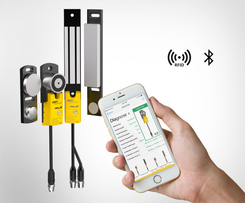 Die magnetische Prozesszuhaltung HoldXR von SSP Safety System Products kombiniert in kleiner Bauform einen sicheren berührungslosen RFID-Sicherheitssensor (Ple) mit einem intelligenten Elektromagneten. Sie ist je nach Bauform mit 500N oder 1.200N erhältlich und über ein- und ausgehende Pigtail-Kabel lassen sich bis zu 17 Geräte in Reihe schalten. Die Leitung wird einfach durchgeschleift und damit der Verkabelungsaufwand reduziert. Die Besonderheit dabei: Über einen internen Bus, der ganz ohne Gateway zur übergeordneten SPS ausgewertet werden kann, lässt sich jede einzelne Einheit separat auswerten und sogar ansteuern. Eine Bluetooth-Schnittstelle ermöglicht dem Anwender außerdem mit einer App sogar mobil auf die Diagnosefunktion der Zuhaltungen zuzugreifen und etwa den Fehlerspeicher einzusehen. Der RFID-Sicherheitssensor ist wahlweise auch in hochcodierter Ausführung erhältlich.