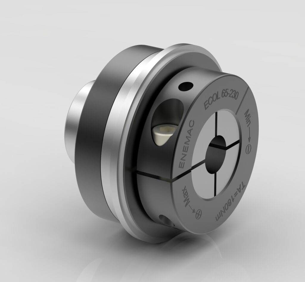 Sicherheitskupplungen werden eingesetzt um hochwertige Maschinenteile und Produkte, mechanisch vor Überlastungen im Antriebsstrang zu schützen. Binnen Sekunden wird die Drehmomentübertragung zwangstrennend und unabhängig von etwaigen Stromausfällen etc. unterbrochen. Der Hub der Tellerfeder kann dabei von einem Sensor abgetastet und daraufhin ein Notstopp der Maschine veranlasst werden. Da Enemac-Sicherheitskupplungen mit einer 360°-Synchron-Raststellung versehen sind, rasten sie selbstständig nach einer Umdrehung wieder ein, so kann durch langsames Anfahren der Maschine die Kupplung nach einem Stopp, ohne langwierige Montagearbeiten, wieder gangbar gemacht werden. Die Baureihe Ecol ist für Anbauteile mit kleinem Befestigungsteilkreis wie Zahnscheiben, Zahnräder und Kettenräder konzipiert. Zur Befestigung auf der Welle besitzt der Drehmomentbegrenzer eine radiale Klemmnabe für Wellen bis zu 58mm. Die Sicherheitskupplung ist geeignet für einen Drehmomentbereich zwischen 2Nm und 800Nm bei Temperaturen bis zu 200°C. Es stehen zwölf Baugrößen zur Verfügung, die bei bis zu 4.000U/min eingesetzt werden können.