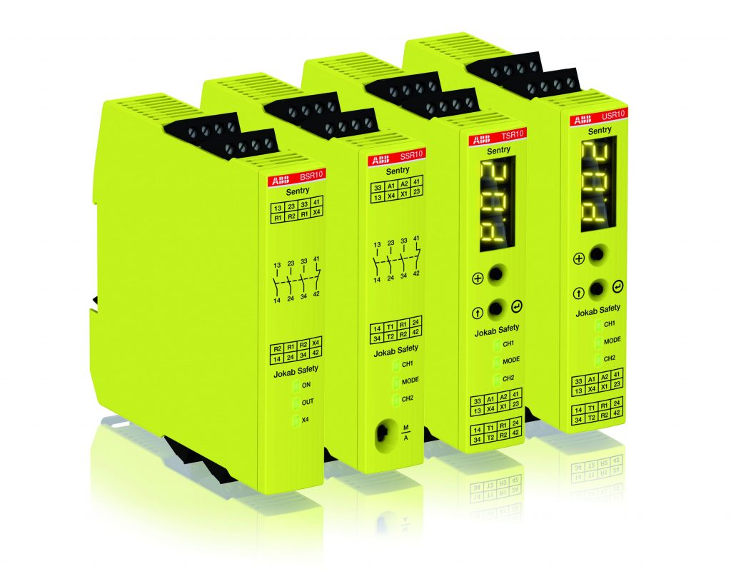 Die neue Baureihe Sentry von ABB umfasst das gesamte Spektrum an Sicherheitsrelais von Basismodellen für einfache Sicherheitsanwendungen und Erweiterungen von Sicherheitsausgängen bis hin zu Universalmodellen mit genauen Timerfunktionen. Die Baureihe deckt damit alle Arten von Sicherheitsapplikationen ab, da die Signale der angeschlossenen Sicherheitsprodukte überwacht werden. Sowohl manueller als auch automatischer Reset kann über einen Schalter an der Vorderseite der Relais ausgewählt werden. Die Multi-Reset-Funktion ermöglicht das Zurücksetzen von bis zu 10 Sicherheitsrelais Sentry mit einem Reset-Schalter, wodurch Resetverfahren und -anschlüsse vereinfacht und Ausfallzeiten minimiert werden. Darüber hinaus können die Anzahl benötiger Reset-Schalter, die Länge der Kabel, der Platzbedarf, die Installationszeit und bei einigen Anwendungen sogar die Anzahl benötigter Sicherheitsrelais reduziert werden. Die Sicherheitsrelais sind miteinander verbunden und kommunizieren über den Reset-Anschluss.