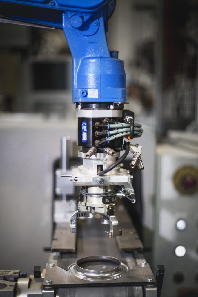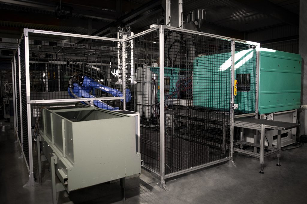 Alles aus einer Hand – ein Versprechen, von dem man häufig hört. Doch mit Wireless Safety, einem Aluminiumschutzzaun, Nothalt-Tastern und einer Sicherheits-Türzuhaltung liefert die Firma SSP Safety System Products Kunden nicht ein breites Produktspektrum, sondern bietet auch schlüssige Sicherheitskonzepte. So z.B. für die Automatisierung eine Spritzgusszelle bei Denk Kunststoff Technik. Die Spritzgusszelle besteht aus einer Spritzgussmaschine des Herstellers Arburg, zwei Yaskawa-Robotern und zwei Förderbändern für die Zu- und Abführung. Die Metallringe werden als Rohlinge über einen Bunker in einen Schwingförderer transportiert und dort vereinzelt, ehe sie über ein Transportband in Endlage gebracht werden. Dort wird ein Ring vom ersten Roboter entnommen und in eine Heizstation übergeben. Danach entnimmt ihn ein zweiter Roboter legt ihn in die Spritzgussmaschine ein, wo die Rohlinge im 2K-Verfahren mit Kunststoff ummantelt werden. Der Einsatz einer Drehdurchführung und eines Werkzeugwechslers, die beide von RSP Robot System Products geliefert wurden, ermöglicht den Robotern dabei eine möglichst flexible Drehung der sechsten Achse sowie das Wechseln der Werkzeuge. Über ein Förderband werden die Fertigteile, ein Haltering, welcher bei einem Federbeinlager zum Einsatz kommt, schließlich aus der Fertigungszelle ausgeschleust.