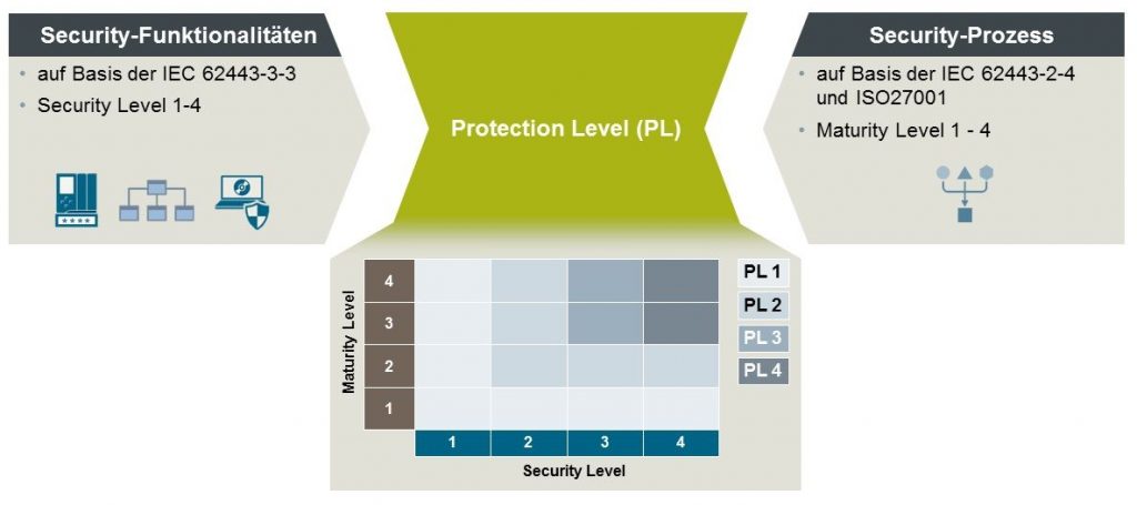 Kombiniert man die Bewertung der umgesetzten funktionalen Maßnahmen der Automatisierungslösung nach Security Level (SL 1 bis SL 4) und den Reifegrad bei der Umsetzung der dazugehörigen organisatorischen Maßnahmen (ML 1 bis ML 4) in einer zweidimensionalen Matrix, dann kann man jedem Feld der Matrix einen Schutzlevel zuordnen. Die Fähigkeit zum Schutz der Security Levels entspricht bei den Schutzlevels einem tatsächlichen Schutz, der durch die Ergänzung der funktionalen Maßnahmen durch die dazugehörigen organisatorischen Maßnahmen erreicht werden kann. Daher kann man für die Schutzlevels (engl. Protection Levels), für die im Weiteren die Abkürzung PL verwendet wird, die in der Norm enthaltene Definition der Security Levels übernehmen: