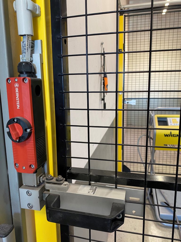Die Überwachung der beiden Verriegelungsschalter übernimmt ebenfalls ein Bernstein-Produkt, und zwar das programmierbare Sicherheitsrelais SCR P. Hierbei ist jede Roboterzelle mit einem separaten SCR P ausgestattet, das mit dem entsprechenden Verriegelungsschalter der Zugangstür verdrahtet ist. Beim Öffnen der Tür stoppt daher nur der Lackierroboter des zugehörigen Sicherheitsbereiches, nicht aber der zweite Roboter hinter der anderen Gittertür, der ungehindert weiterarbeiten kann.