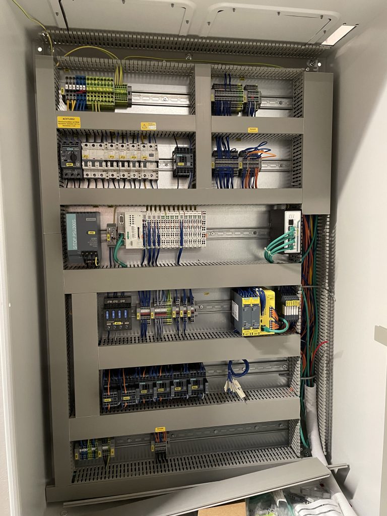 Die Sicherheitsauswertungen sind hingegen so untereinander verschaltet, dass die angeschlossenen Not-Halt Geräte die gesamte Maschine stoppen, wenn es darauf ankommt. Der externe Not-Halt des Fördersystems, welches die Gehäuseteile durch die Lackierkabinen befördert, kann ebenfalls durch die SCR P-Geräte ausgewertet werden und so beide Roboter im Falle eines Stillstands anhalten.