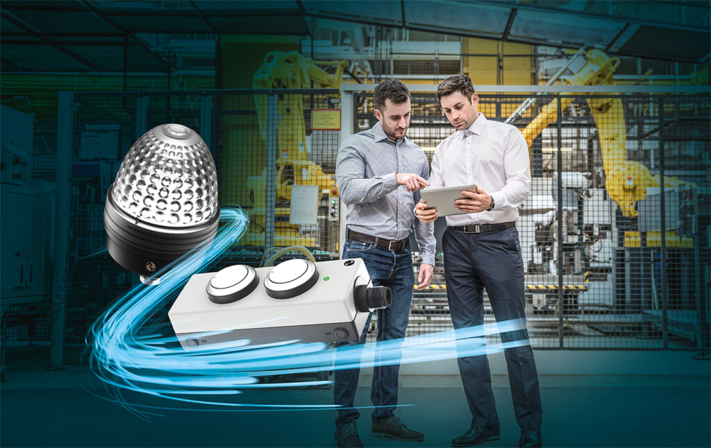 Zur unkomplizierten feldtauglichen IO-Link-Vernetzung dezentraler Maschinen und Anlagen führt der HMI-Spezialist Rafi spezielle Varianten seiner E-Box-Tasterboxen und Signalleuchten Tilted Diamond+ im Programm. Die LED-Signalleuchten mit frei konfigurierbaren Nachteinstellungen und Leuchtenfarben aus dem gesamten RGB-Farbspektrum verfügen über acht unterschiedliche Blinkmodi, um spezifische Alarme oder Maschinenzustände beispielsweise durch Blitzen, Blinken oder pulsierendes Leuchten zu signalisieren. Sie sind in Schutzart IP66 gefertigt und zeichnen sich durch besondere Helligkeit, Erschütterungsresistenz, Wartungsfreiheit sowie ihre außergewöhnliche kuppelförmige Blendengestaltung aus. Durch die rundum angeordneten diamantförmigen Linsen, denen die Leuchten ihren Namen verdanken, erzielen die Blenden eine sehr gute Ausleuchtung, klare Signalfarben und hohe Sichtbarkeit über große Distanzen.