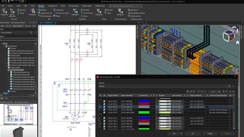 Auf der Hannover Messe wurden erste Einblicke in die kommende Eplan-Plattform 2024 gewährt. Diese bietet mathematische Berechnungsfunktionen, mehr Komfort in der Klemmenverwaltung und neue Möglichkeiten zur Navigation im 3D-Modell des Schaltschranks. Das erleichtert auch die Erstellung des digitalen Zwillings in Eplan Pro Panel. Darüber hinaus können beim Thema Maschinenverkabelung im Zusammenspiel mit Eplan Harness ProD Reserve-Adern in Zukunft per Klick angeschlossen werden.