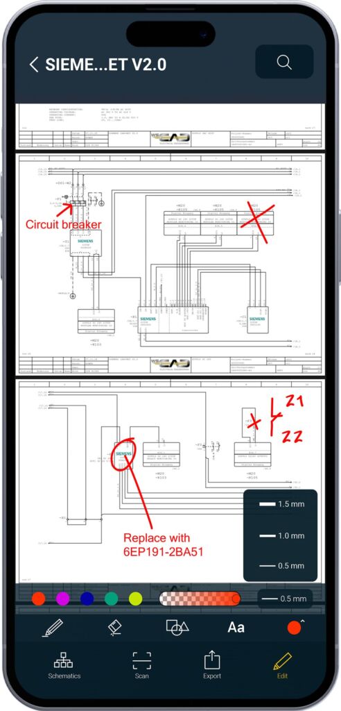 Ganz neu ist die innovative Redlining-Funktion mit PDF-Export. Der Begriff Redlining stammt ursprünglich aus der Druck- und Verlagsbranche. Damit werden Änderungen an technischen Zeichnungen, Plänen, Verträgen oder anderen Dokumenten markiert und für alle Beteiligten sofort erkennbar hervorgehoben. Genau dies ist jetzt mit der Cabinet AR App in den elektrotechnischen Unterlagen möglich. Änderungen und Kommentare können vor Ort vorgenommen werden und stehen sofort allen Beteiligten inklusive den Konstruktionsabteilungen zur Verfügung. Dies vereinfacht die Kommunikation, schafft Transparenz und stellt die Nachvollziehbarkeit sicher.