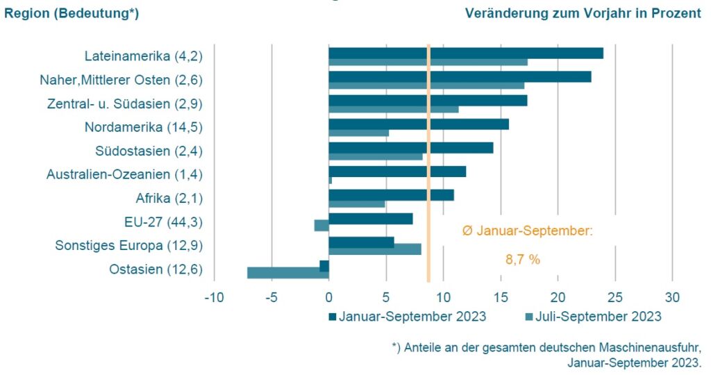 Die Unternehmen des Maschinen- und Anlagenbaus aus Deutschland erzielten im dritten Quartal zwar ein leichtes Exportplus, im Jahresverlauf schwächten sich die Zuwachsraten jedoch deutlich ab. Das ist das Ergebnis der jüngsten Auswertungen des VDMA. Die Maschinenausfuhren im dritten Quartal stiegen demnach um +2%. Für die ersten drei Quartale ergibt sich ein Zuwachs von +9% auf knapp 156Mrd.€. Positiv entwickelten sich die Maschinenlieferungen in den größten Exportmarkt USA, sie stiegen um +16%. Die Exporte nach China lagen hingegen bei -0,1%. Die Maschinenausfuhren in die EU wuchsen um +7%.