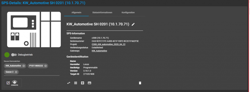 Wie kann das dreiköpfige Entwicklerteam das Update-Verfahren beschleunigen? Auf der Suche nach einer Lösung fand man am Markt nichts, was die Anforderungen erfüllte. Ein wesentliches Kriterium: Der Aufwand für die Pflege einer geeigneten Infrastruktur sollte möglichst gering sein. So wurden die Entwickler 2019 über einen Fachartikel auf den Codesys Automation Server aufmerksam, der sich damals noch in der Beta-Phase befand. Lang startete erste Versuche an seinem Schreibtisch, um Steuerungen in den Server einzubinden, Quellcode sowie die Binär-Applikationen für die Steuerungen in seinen Tenant, sprich sein geschütztes Server-Konto zu laden, und diese Applikationen auf die angebundenen Steuerungen zu übertragen. Umfangreiche Hilfsdokumentationen und einige kurze YouTube-Videos reichten aus, um sich schnell in dem intuitiv zu bedienendem System zurechtzufinden. Nach etwa einem halben Tag waren so die ersten Steuerungen mit dem Codesys Automation Server verbunden. Daraus entstand für Gebhardt die Überzeugung: Diese Lösung ist geeignet, um das geschilderte Update-Verfahren deutlich zu beschleunigen. Nach dem Schreibtischexperiment und kleineren Anpassungen am Codesys Automation Server zur bestmöglichen Unterstützung der C300-Steuerungen wagte man den nächsten Schritt: die Anbindung des Codesys Automation Servers an das eigene Echtlager in Sinsheim. Nachdem die erforderlichen Applikationen in den Server geladen und die Steuerungen eingebunden waren, wurde die Applikationssoftware über den Server auf die Steuerungen ausgerollt. Für einen direkten Vergleich wurde die Applikationssoftware mit dem bisherigen Verfahren in einem weiteren Lager in Betrieb genommen. Der Unterschied war deutlich: Während Dominik Lang und seine Kollegen mit ihrem bestehenden Prozess ca. zwei Stunden für die Einrichtung des Lagers benötigten, war das Lager mit dem Automation Server nach 20 Minuten in Betrieb – und damit sechs mal schneller.
