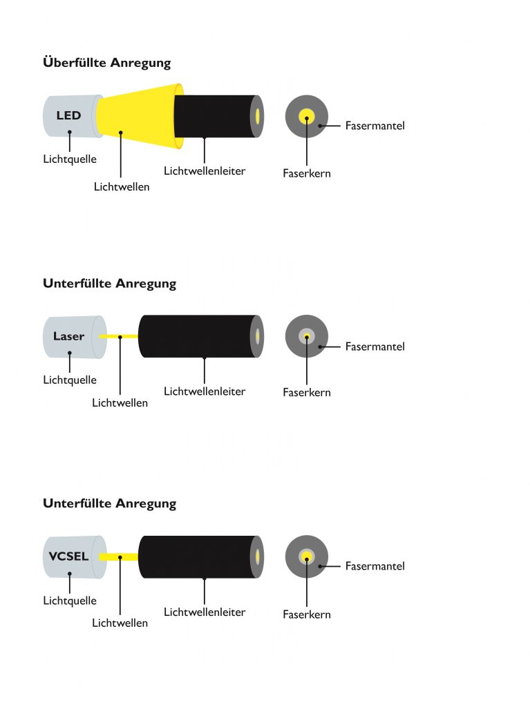 Werden die zuvor beschriebenen Voraussetzungen erfüllt, können bei Multimode-Komponenten noch immer große Abweichungen der gemessenen Einfügedämpfungswerte auftreten. Diese Abweichungen kommen durch unterschiedliche Messgeräte zustande, da im Feld in aller Regel andere Messgeräte verwendet werden als in der Fertigung oder im Labor. Die entsprechenden Sender verfügen daher auch über unterschiedliche Lichtquellen, die wiederum unterschiedliche Lichtverhältnisse produzieren. Gerade bei Multimode-Messungen an Quarzglas-Lichtwellenleitern G50/125µm und G62,5/125µm wirken sich diese unterschiedlichen Lichtverhältnisse in den Messergebnissen der Einfügedämpfung aus. Wichtige Einflussgrößen sind hier Lichtmenge und Modenverteilung – sie unterscheiden sich je nach Art der verwendeten Lichtquelle. In den Anfangsjahren der LWL-Messtechnik wurde mittels Licht-emittierender Dioden (LED = light-emitting diode) Licht in den Multimode-Lichtwellenleiter eingekoppelt. Heute kommen überwiegend Oberflächen-emitierende Halbleiter-Laser (VCSEL = vertical-cavity surface-emitting laser) zur Messung von Quarzglas-Multimode-Fasern G50/125µm – z.B. in den Kategorien OM3 und OM4 – zum Einsatz. Während LED-Lichtquellen einen breiten Lichtstrahl bei überfüllter Anregung erzeugen, geht von Laser-Lichtquellen ein schlanker gerichteter Lichtstrahl bei unterfüllter Anregung aus. In den zurückliegenden Jahren wurden unterschiedliche Methoden zur Definition der Lichtverteilung beschrieben und als Multimode-Anregungsbedingungen in Normen festgelegt. Da sich in Multimode-Fasern das Licht in unterschiedlichen Moden ausbreitet, kommt der Eliminierung der unstabilen Moden höherer Ordnung eine besondere Bedeutung für reproduzierbare Messergebnisse zu. Eine vergleichsweise einfache technische Lösung bieten sogenannte Glasfaser-Wickeldorne. Das Wirkprinzip der Wickeldorne beruht auf der unterschiedlichen Streuung der Lichtmoden. Während sich die Moden niedriger Ordnung stabil längs entlang des Glasfaserkerns ausbreiten, streuen die Moden höherer Ordnung v.a. bei stark gekrümmten Lichtwellenleitern. Diese Krümmung wird mittels Wickeldorn erreicht. Die umhüllte oder ummantelte Multimode-Glasfaser wird mehrfach um eine solche Spindel mit einem definierten Durchmesser gewunden. Da der Wickeldurchmesser in Abhängigkeit der gewählten Norm für die gleiche Faserstärke unterschiedlich vorgegeben wird, können aber noch immer unterschiedliche Lichtverhältnisse an der Einkoppelstelle der zu messenden LWL-Komponente (DUT = Device under Test) auftreten. Somit ist die tatsächliche Anregung an der Einkoppelstelle unbekannt.