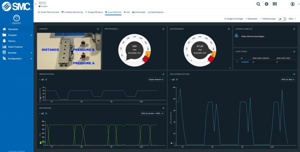 Die Daten müssen zunächst einmal gesammelt und weitergeleitet werden. Die Lösung Smart Field Analytics setzt auf Technologien für komplett neue Greenfield-Maschinen aber auch für bestehende Brownfield-Anlagen, um sie fit für die Zukunft zu machen. „Aufgrund zunehmender Vernetzung und dezentraler Intelligenz lassen sich sehr große Effizienz- und Produktivitätspotenziale erschließen“, sagt Oliver Prang, Digital Business Development bei SMC. „Die Sensoren und Aktoren jeder Anlage sind prädestiniert dafür, die dafür erforderlichen Daten zu sammeln.“ Mit Informationen wie der Anzahl an Arbeitszyklen, der Kraft pneumatischer Zylinder oder den Leistungsdaten und Messergebnissen von Durchfluss- und Drucksensoren erhalten Anwender ein detailliertes Bild vom Zustand ihrer Maschine. „Die Hardware dafür ist bereits vorhanden – z.B. mit IO-Link-fähigen Sensoren, die ihre Daten direkt an die übergeordnete Systemsteuerung oder SPS weitergeben können“, erklärt Prang. Richtig interpretiert, lassen sich die Informationen aus der Anlage in wichtige Hinweise und Empfehlungen umwandeln.