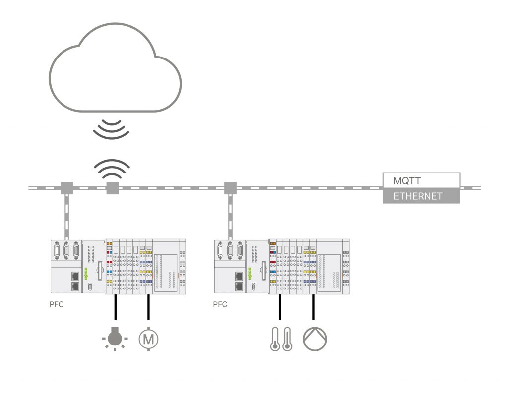 Die Anbindung an die Feldebene erfolgt mit dem Wago-I/O-System 750 oder 750 XTR, wobei die Daten in die Cloud Data Control über eine SPS der PFC-Familie gesendet werden. Durch eine Firmware-Erweiterung und die Programmierung einer IEC-Applikation mit der entsprechenden Bibliothek werden die Steuerungen PFC100 und PFC200 mit nur wenigen Handgriffen zum IoT-Device. Dann lassen sich Zustandsinformationen wie Run/Stop, Verbindungsstatus, Geräteinformationen sowie im IEC-Programm definierte Variablen in die Cloud senden und beispielsweise visualisieren. Die Kommunikation zwischen den PFCs und der Cloud Data Control erfolgt über das MQTT-Protokoll und ist verschlüsselt. Das Update kann der Anwender mit Hilfe des Web-Based-Managements (WBM) bequem im Webbrowser vornehmen. Die Konfiguration der Cloud-Verbindungsdaten erfolgt ebenfalls mittels WBM. Darüber hinaus sind auch Bibliotheken für CODESYS 2.3 und e!COCKPIT im Lieferumfang enthalten. Im IEC-Programm können die Variablen definiert werden, die in die Cloud übertragen werden sollen. Sensible Daten verlassen das Unternehmen auf diese Weise nicht. Die Wago-Controller PFC100 und PFC200 bilden damit das Bindeglied zwischen den Elementen der realen und digitalen Welt. Mit der Vielzahl an Schnittstellen bieten sie außerdem eine passende Grundlage für ein IoT-Gateway. Sie sind modular und skalierbar, können jedes Feldsignal einsammeln, sprechen alle Industrieprotokolle und ermöglichen sogar die Cloud-Anbindung von Sensoren und Aktoren, die selbst keine Internet-Schnittstelle haben.