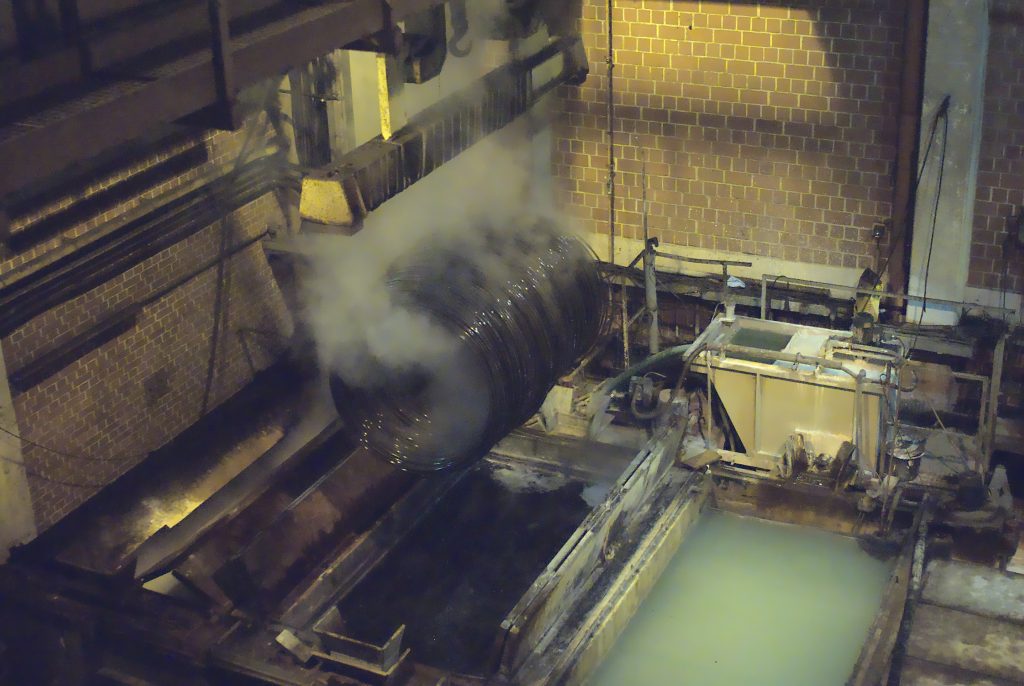 Dampfschwaden und beißender Geruch steigen von den tonnenschweren Drahtringen auf, die zwei Krane nacheinander in verschiedene Bäder mit Säure und anderen Chemikalien tauchen. Die Beize bei der Rudolf Rafflenbeul Stahlwarenfabrik in Hagen, in der die Oberflächen der Drähte für die Tochterfirma Volme-Draht behandelt werden, arbeitet vollautomatisch. Die Oberflächenbehandlung ist entscheidend für die Weiterverarbeitung im eigenen Drahtzug oder beim Kunden.