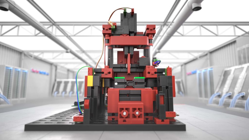Die 24V-Biegemaschine von Fischertechnik simuliert den Transport und das Biegen von Werkstücken. Das Modell kann entweder im Halbautomatik- oder im Automatikbetrieb genutzt werden. Im Halbautomatikbetrieb werden die ungebogenen Werkstücke manuell in den Transportschlitten eingelegt. Im Automatikbetrieb positioniert sich der Transportschlitten automatisch unter einem Magazin, das die Werkstücke bereitstellt. Anschließend transportiert der beladene Schlitten das Werkstück zur Biegemaschine, wo es gebogen wird. Danach bringt der Transportschlitten das gebogene Werkstück zur Entnahmestelle. Die Biegemaschine beinhaltet umfangreiche Lernmaterialien für die SPS-Programmierung. Am Ende der Lerneinheit ist der Nutzer in der Lage, das Maschinenmodell eigenständig zu verkabeln und in der grafischen Programmiersprache FUP oder in strukturiertem Text zu programmieren.