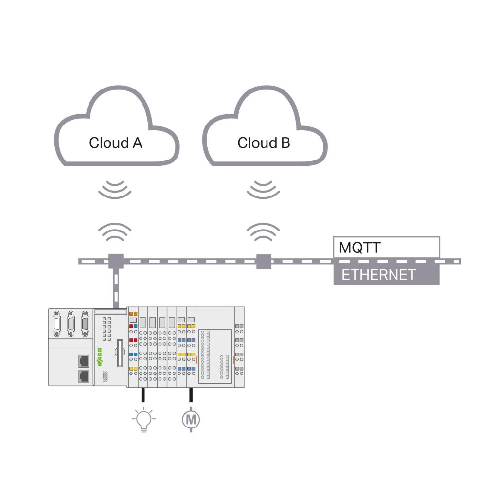 Wago bietet jetzt für Touch Panels und die Controller der PFC200-Serie Multi-Cloud-Konnektivtität an. Damit ist die parallele Anbindung eines Geräts an zwei verschiedene Cloud-Systeme, IoT-Plattformen oder MQTT-Broker möglich. Unterschiedliche Aufgaben lassen sich in der jeweils passenden Cloud-Anwendung umsetzen. So ist etwa das Device-Management in der Wago Cloud möglich, während spezifische Aufgaben in einer weiteren IoT-Lösung, z.B. auf Basis von IBM Watson oder AWS, realisiert werden. Auch eine Aufteilung der Daten kann erfolgen. So können etwa kritische Daten an einen lokalen MQTT-Broker gehen und alle anderen in eine Cloud. Die Konfiguration erfolgt im Web-Based-Management (WBM) des PFC200 oder des Touch Panels; die Programmierung geschieht in gewohnter Weise im Tool eCockpit.