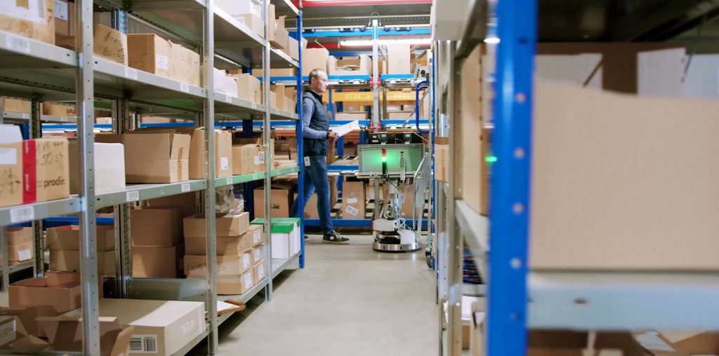 Die Werbemittel bei der Ratiopharm-Tochter Transpharm Logistik wechseln jedoch häufig, haben unterschiedliche Formen, Größen und Gewicht. Mitarbeiterinnen und Mitarbeiter kommissionieren sie daher stets individuell für die jeweiligen Empfänger. Dennoch sollte Martin Zwiebel, Supply Chain Analyst bei Transpharm, auch diesen Werbemittelversand weiter verbessern. „Die Mitarbeiterinnen und Mitarbeiter kommissionierten Werbeartikel früher mithilfe sperriger Kommissionierwagen“, beschreibt Zwiebel die Situation. Mit Tablets ausgerüstet und teils durch Pick-by-Light-Systeme unterstützt, suchten sie die Ware aus dem gesamten Lager zusammen und fuhren den fertig kommissionierten Wagen eigenständig in die Packerei, wo die Werbemittel versandfertig gemacht wurden. „Auf der Suche nach einer schnelleren und einfacher zu handhabenden Lösung stellte sich heraus, dass ein fahrerloses Transportsystem deutliche Vorteile versprach“, so der Analyst weiter. Gefunden werden musste also ein bezahlbarer Roboterwagen, der selbstständig seinen Weg zum nächsten Lagerplatz findet, dabei einer festgelegten Route folgt und so zum ständigen Begleiter der Mitarbeitenden wird, der eigenständig fährt.