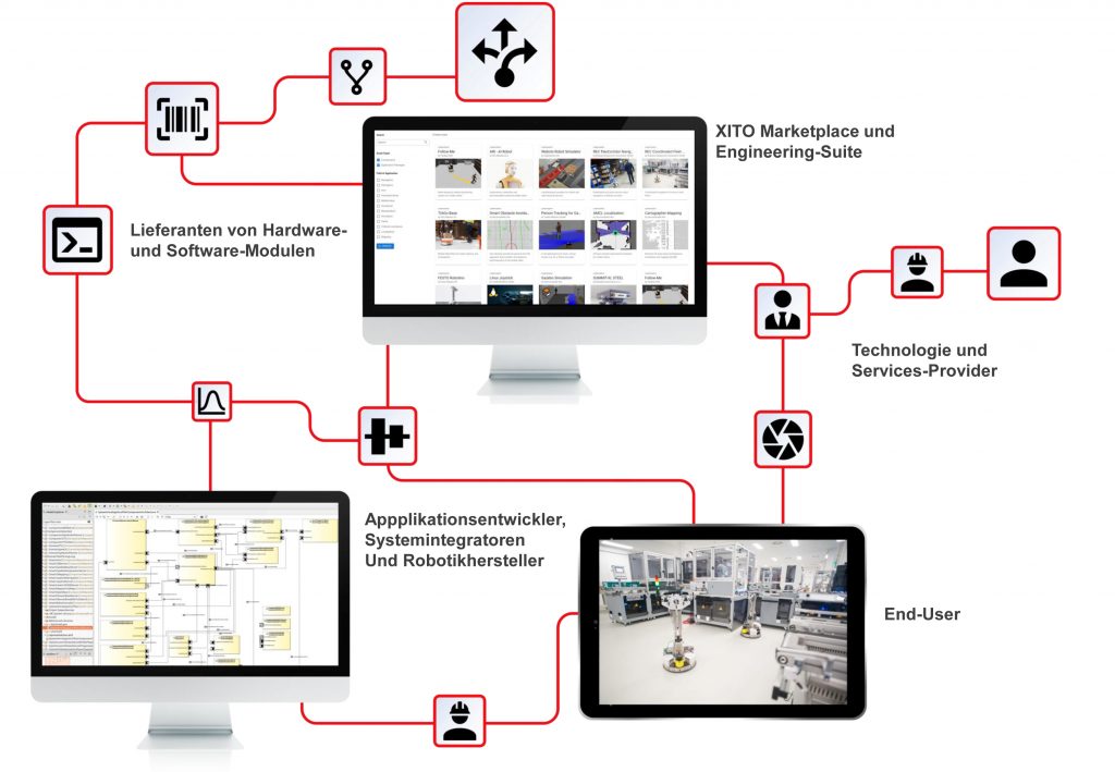 „Ich kann mir jeweils die besten Komponenten vom Xito-Marktplatz raussuchen und sie miteinander verbinden“, schwärmt Zwiebel. Der Xito-Marktplatz bietet mittlerweile über 50 Hardware-Bausteine für unterschiedliche autonome Transportlogistik und mobile Pick&Place-Robotikanwendungen: Navigation, Augmented- oder Virtual-Reality, Lokalisierung, intelligente Hindernisvermeidung, Sprach- und Objekterkennung sowie RFID-Leser. Sogar Greifen und Positionieren wäre möglich.