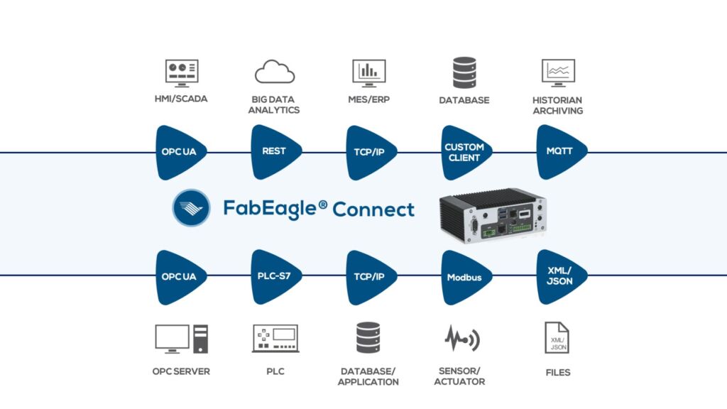 Eine Kernkomponente ist FabEagle Connect. Diese konfigurierbare Low-Code-Schnittstellen-Integrationslösung für Industrie-4.0- und IoT-Anwendungen ermöglicht die herstellerunabhängige Einbindung der vorhandenen System- und Hardwarelandschaft in einer Industrieanlage durch reine Parametrierung. Sie löst so die bisherigen Grenzen zwischen Datenerzeugung, Datenverarbeitung und Datenbereitstellung auf und ermöglicht die Verschmelzung von IT und OT. Ebenfalls zu dieser Produktfamilie gehören das fabrikweite Monitoringsystem FabEagle Monitoring für Betriebsdatenerfassung und -management (BDE/BDM) und FabEagle LC als Leitsystemlösung für ganze Produktlinien. Als offenes Softwareframework realisiert der ToolCommander die Steuerung und Visualisierung von Anlagen in der Halbleiterindustrie. Zusätzlich steht mit K-SYS eine Codesys-kompatible Soft-SPS gemäß IEC61131-3 zur Verfügung. Das QIWI-Toolkit zur Schaffung web-basierter Visualisierungen per Konfiguration ergänzt das Portfolio in diesem Bereich.