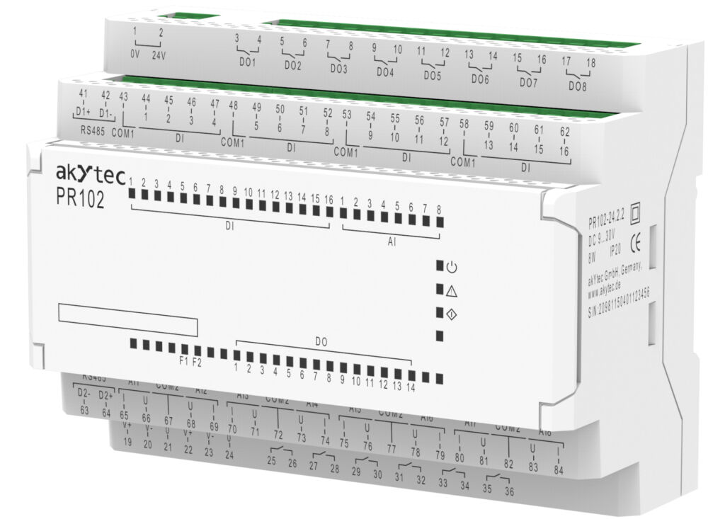 Das Modell PR225 mit Panelgehäuse und 3,5-Zoll-Grafikdisplay eignet sich zur Steuerung von Lüftungs-, Heizungs- und Klimaanlagen. Es kombiniert diskrete sowie analoge Ein- und Ausgänge. Ethernet- und RS-485-Schnittstellen ermöglichen die Erweiterung mit externen Modulen, die Integration in übergeordnete Systeme und den Datenaustausch mit der (kostenfreien) Akytec-Cloud.
