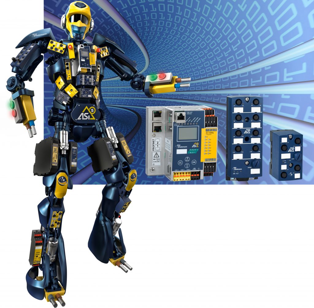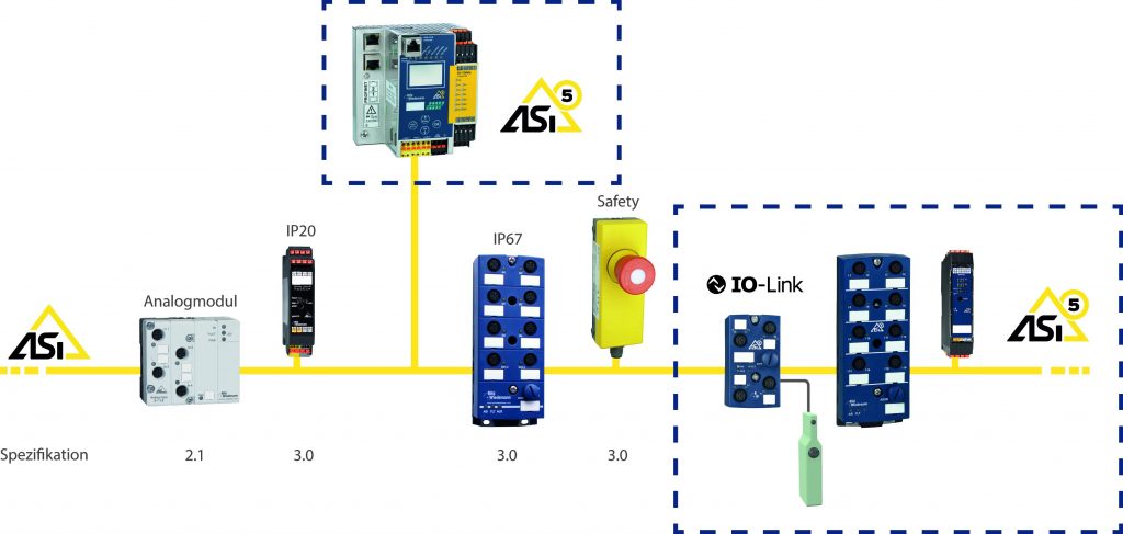 Bei ASi im Allgemeinen und bei ASi-5 im Speziellen denken viele erst einmal an ein gelbes, zweiadriges Profilkabel, an den Geräteanschluss in Durchdringungstechnik oder an Hutschienenmodule im Schaltschrank. Doch der neue Feldbusstandard kann mehr: Mit einer ausgesprochen hohen Datenbreite und sehr kurzen Übertragungszeiten soll ASi-5 der Automatisierungstechnik im Rahmen der Digitalisierung neue Möglichkeiten eröffnen. Dabei wird Bewährtes nicht über Bord geworfen – vielmehr kommunizieren ASi-5 und ASi-3 im gleichen Netz, so dass Anwender bisherige Lösungen um ASi-5 Module und deren Funktionalität erweitern können. Die bisher bestehenden Vorteile der ASi Technologie – etwa der im Vergleich zu anderen Feldbuslösungen deutlich reduzierte Verdrahtungsaufwand, die freie Wahl der Topologie sowie die kostengünstige Integration von Safety auf derselben Infrastruktur – bleiben auch bei ASi-5 erhalten.