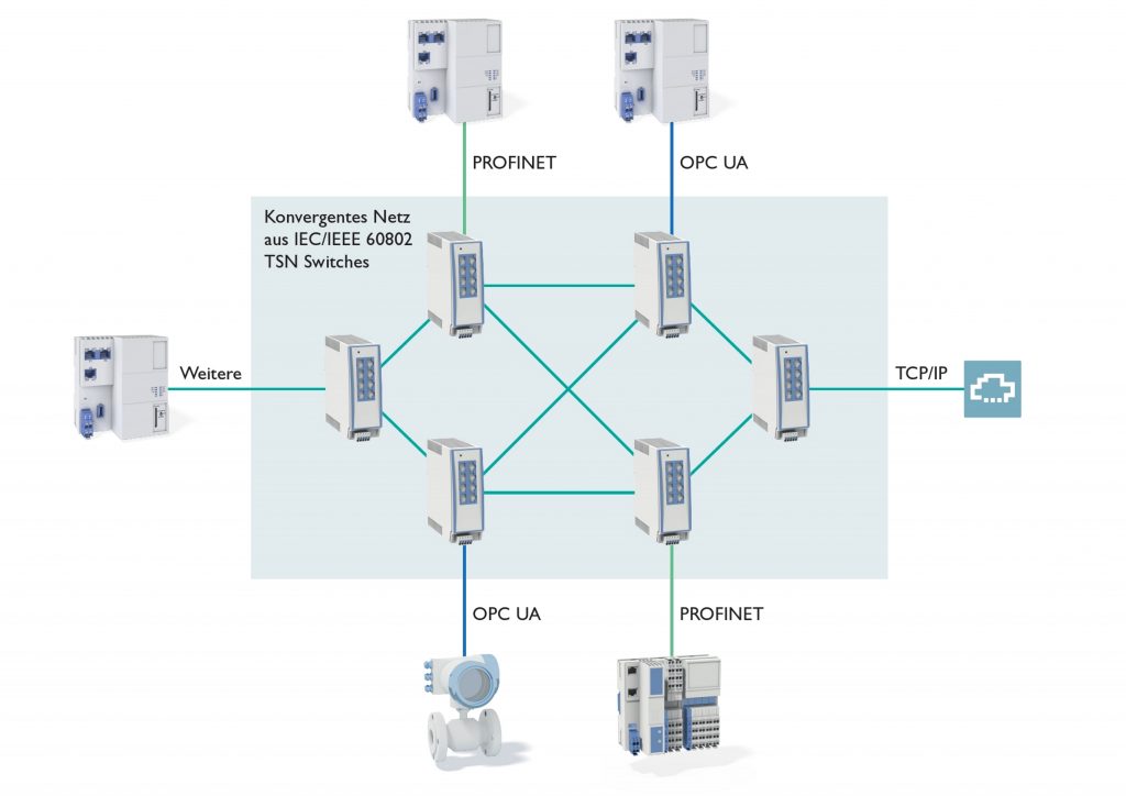 Ein großer Vorteil von Ethernet liegt jedoch in der markt- und applikationsübergreifenden Standardisierung durch die zuständige Organisation IEEE (Institute of Electrical and Electronics Engineers) und hier das Projekt IEEE802. Die Standardisierung sorgt für eine breite, kostengünstige und interoperable Verfügbarkeit von Ethernet-Basistechnologien und -Bausteinen. Von diesen Vorzügen profitieren auf Ethernet beruhende Systeme wie z.B. Profinet RT oder Modbus/TCP, denn jedes IEEE802-konforme Endgerät und jeder Switch kann für den Datenaustausch verwendet werden. Bei den Aktivitäten der IEEE802 stand die Nutzung von Ethernet in Applikationen mit harten Echtzeitanforderungen – z.B. Motion Control – bislang allerdings nicht im Fokus. Daher gibt es für derartige Anwendungsszenarien heute spezielle Ausprägungen – etwa Profinet IRT -, die nicht durch die IEEE802 standardisiert sind, teilweise nur eine Datenrate von 100MBit/s unterstützen sowie besondere Gerätehardware bedingen. Diese Situation kann sich mit TSN ändern. Durch ein entsprechendes Bündel von Mechanismen, die von der IEEE802 standardisiert sind, wird Ethernet echtzeitfähig und ermöglicht höhere Bandbreiten als 100MBit/s bei gleichzeitiger Nutzung des Netzwerks für IT- und Automatisierungsanwendungen. Damit lässt sich das Netzwerk für sämtliche IT- und echtzeitkritischen Applikationen einsetzen. Diese Eigenschaft wird als Konvergenz bezeichnet und bietet darüber hinaus eine Reihe weiterer Vorteile. Für Anwender und Applikationen zählen dazu Bandbreiten von 1GBit/s und mehr, Übertragungsgarantien, stoßfreie Medienredundanz, die Verwendung von Standard-Switches, kurze Zykluszeiten sowie perspektivisch vergleichbare Gerätekosten. Hersteller profitieren von der Nutzung von Standard-Chips in Steuerungen, Switches und Feldgeräten sowie einer Produkthardware für alle TSN-Einsatzszenarien. Als wesentlich zeigt sich, dass sich die TSN-Standards auf die unteren Schichten von Ethernet beziehen. Die Anwendersicht ist weitgehend unabhängig und kann für vorhandene Standards – beispielsweise Profinet – bestehen bleiben.