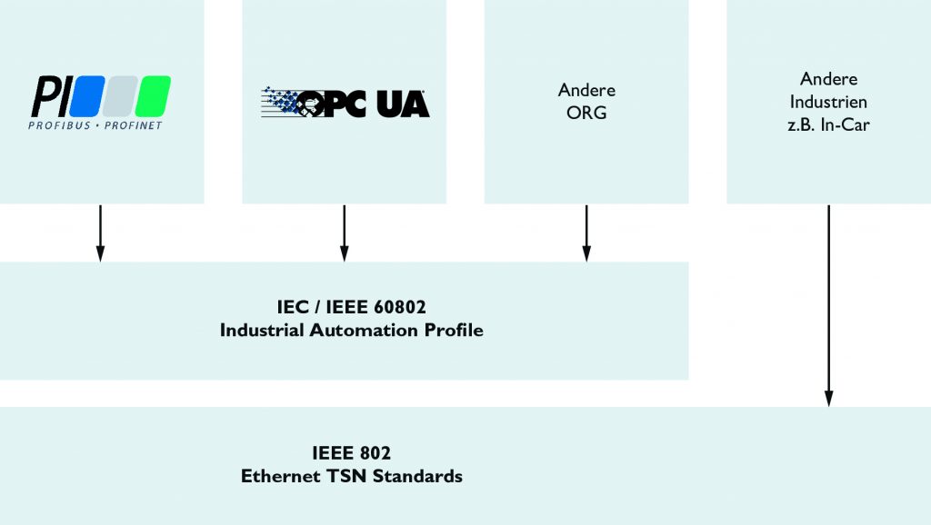Eine wichtige und notwendige Eigenschaft der heutigen Feldbussysteme ist ihre herstellerübergreifende Interoperabilität. Automatisierungsexperten sind es gewohnt, Geräte unterschiedlicher Hersteller in einer Maschine oder Anlage zu einer funktionierenden Lösung zu kombinieren. Diese Interoperabilität wird durch die großen Feldbusorganisationen über spezifische Maßnahmen – z.B. Zertifizierungen – sichergestellt. Die konvergente Verwendung eines TSN-Netzwerks kann nur erfolgreich sein, wenn sie auch eine vergleichbare Interoperabilität zur Verfügung stellt. Dazu bedarf es einer herstellerübergreifenden Festlegung, welche Mechanismen aus dem TSN-Bündel wie genutzt werden sollen. Die IEEE802 trifft hier keine Bestimmungen, um den branchenübergreifenden Einsatz von Ethernet zu garantieren. Deshalb haben sich die für die Feldbussysteme verantwortliche Organisation IEC und die IEEE802 als für Ethernet zuständiger Verband zusammengetan und die gemeinsame Aktivität IEC/IEEE802 60802 gegründet. Die Kooperation zielt auf die Profilierung von TSN-Standards zur Verwendung in Automatisierungsapplikationen ab. Daher wird die Aktivität ebenfalls als Industrial Automation Profile (IAP) bezeichnet, das Anwendungen wie im Bild oben dargestellt ermöglicht.