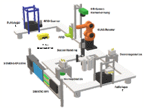 Die Minifabrik besteht aus mehreren Stationen, die über Förderbänder verbunden sind, und simuliert so einen Produktionsablauf unter Realbedingungen. Im Rohmateriallager lagern Paletten in drei Farben mit Würfeln, die auf jeder Seite geometrische Formen wie Dreieck, Quadrat oder Kreis zeigen. Nach Definition von Form und Farbe über die Minifabrik-App wird über RFID-Chips die jeweilige Palette mit dem Würfel automatisch gewählt und über die Transportbänder zur HR-Kamerastation befördert. Dort prüft die Kamera, ob die richtige Würfelseite nach oben zeigt. Ist dies nicht der Fall, dreht der Kuka-Roboter der Minifabrik den Würfel so lange, bis die Kamera die gewünschte Form erkennt. Daraufhin nimmt der Roboter den Würfel auf und transportiert ihn auf die andere Seite der Minifabrik, wo er auf einer Montagepalette abgelegt und zur Montagestation befördert wird. Dort legt ein Druckluftsauger einen Deckel auf den Würfel, was einen herkömmlichen Montageprozess simulieren soll. An der nächsten Station wird der aufgelegte Deckel per Pneumatikzylinder bzw. -kolben verschlossen. Danach ist der Montageprozess abgeschlossen und das fertige Produkt kann im Fertigteillager eingelagert werden. Als integrierter Sicherheitsmechnismus stoppt ein Laserscanner die Anlage, sobald eine Person den Arbeitsbereich des Roboters betritt.