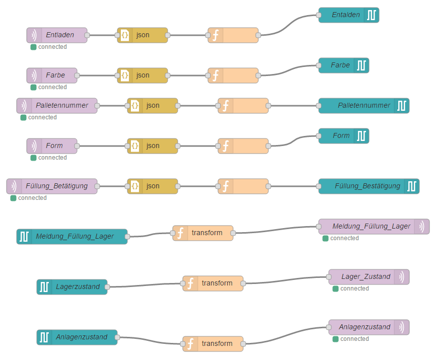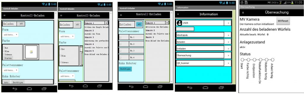 Die verschiedenen Prozessschritte in der Minifabrik, wie Beladen und Entladen der Palette nach Farbe und geometrischer Form des Würfels oder die Steuerung des Kuka-Roboters und die Erfassung der Würfelform mit der Kamera, sollten durch die App angestoßen werden. Funktionen wie das Sortieren nach Farbe und Form oder der Montage- und die Demontagevorgang sollten über eine Überwachungsfunktion zu beobachten sein. Dazu kamen Informationsdienste, die dem Anwender die Funktionsweise der Minifabrik und die Vorgehensweise der App erklären. Weitere Funktionen oder neue Informationsdienste sollten sich ohne großen Aufwand implementieren lassen. Die Entscheidung für die Gestaltung und die Programmierung der App fiel zugunsten von MIT App Inventor, u.a. da das Tool nach Entwicklung der App auch einen Emulator zum Testen bietet. Die einzelnen Komponenten werden dabei zueinander in Beziehung gesetzt und durch Parameter und Kontrollstrukturen, wie bei C++ oder Java, einer logischen Ordnung zugeführt.
