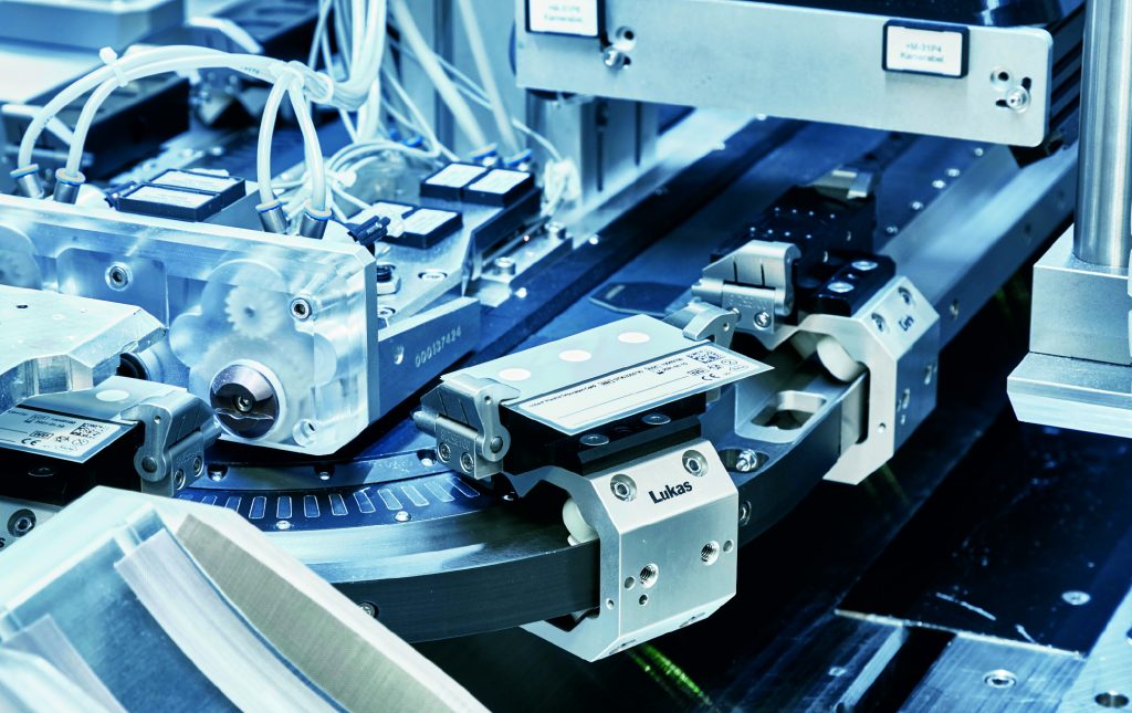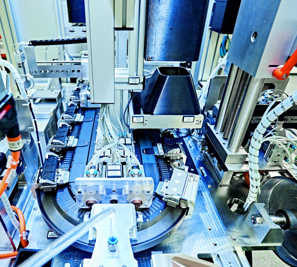 Bei der Entwicklung der Produktionsanlage war das empfindliche und teure Spezialgewebe für die plasmaseparierende Membran zu beachten. Daraus haben sich hohe Anforderungen an den Vlieszuschnitt bzw. eine exakte Einhaltung der gewünschten Geometrie ergeben, um die Kosten aufgrund von Verschnitt möglichst weit zu reduzieren. Weiterhin dürfen die auf das Vlies wirkenden Kräfte 7N nicht übersteigen, um dessen Strukturen nicht zu verändern und somit die Durchlässigkeit des Vliesstoffes zu erhalten. Um das sicherzustellen, wird zum einen die Membran sehr schonend mit einem Laser ausgeschnitten. Zum anderen zeichnet sich die Anlage durch ein spezielles Messverfahren aus. Nach dem Anlagenstart wird zunächst der Bearbeitungstisch vermessen, von dem die Membran abgeholt wird. Anschließend überprüft das System auch die Werkstückträger auf allen zehn Movern des XTS. Auf diese Weise werden alle Bauteiltoleranzen ausgeglichen. Um eine möglichst geringe Prozesskraft auszuüben, wird die Membran mit Vakuumgreifern auf den klebrigen Layer aufgebracht. Bei diesem anspruchsvollen Prozessschritt bietet das Transportsystem den Vorteil, dass sich die ermittelten Bauteiltoleranzen per Software abspeichern und jedem Mover individuell für den gesamten Produktionsprozess zuordnen lassen. Bei einer klassischen Lösung wäre das an jeder Arbeitsstation mechanisch und damit deutlich aufwendiger umzusetzen. Außerdem ist die erforderliche Nachverfolgbarkeit bei XTS automatisch gegeben, was ansonsten z.B. über QR-Codes zu realisieren wäre. Dieses Handling ermöglicht eine effiziente Produktion. Denn etwaige Quetschungen des Vliesstoffes können optisch nicht erkannt werden, sondern erst beim gefertigten, dann als Ausschuss anfallenden Endprodukt.