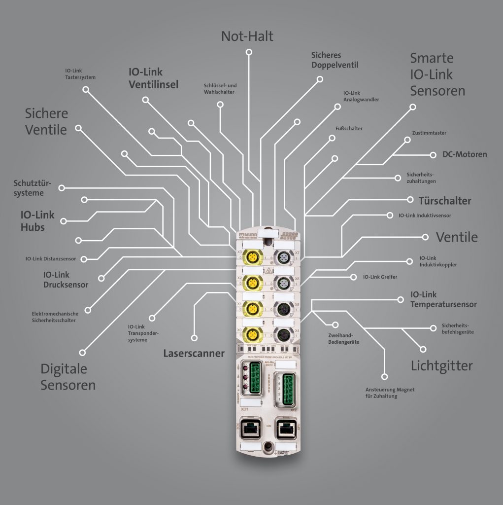 Das Feldbusmodul vereint drei elementare Funktionen der Installationstechnik – digitale Standard-Sensorik und -Aktorik, digitale sicherheitsgerichtete Sensorik und Aktorik sowie IO-Link. Die zwei digitalen Standard-Steckplätze können frei als Ein- oder Ausgang parametriert werden. Die vier sicherheitsgerichteten Steckplätze sorgen dafür, dass nahezu alle digitalen Safety-Anforderungen ohne erhöhten Aufwand in das Installationskonzept eingebunden werden. Die beiden IO-Link-Steckplätze bieten einen großen Funktionsumfang, da sie auch komplexe Sensoren und Aktoren in das Feldbussystem integrieren. Außerdem eignen sie sich zur kosteneffizienten Erweiterung von digitalen Standardsignalen durch IO-Links-Hubs. Das macht Installationen einfacher, ermöglicht Platzeinsparungen und reduziert die Zahl der benötigten Module.