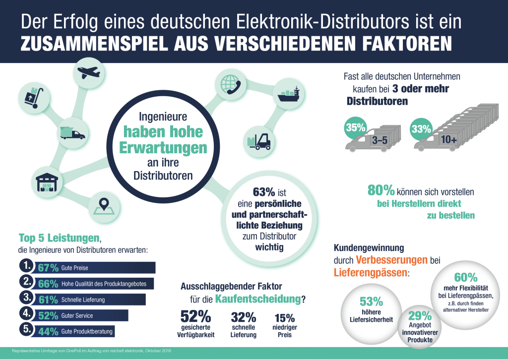 Reichelt Elektronik hat in einer aktuellen europäischen Umfrage knapp 1.000 Ingenieure, darunter 300 aus Deutschland, gefragt, wie sie mit Distributoren zusammenarbeiten, worauf sie dabei Wert legen und mit welchen Services Distributoren sie überzeugen können. Die Studie zeigt, dass das Verhältnis zwischen Distributoren und Kunden sich stetig verändert. Ingenieure erwarten von Distributoren vor allen Dingen folgende Dinge: Gute Preise (67%), eine hohe Qualität der angebotenen Produkte (66%), eine schnelle Lieferung (61%), einen guten Service, z.B. bei Reklamationen (52%) sowie eine gute Beratung zu den Produkten (44%). Kunden schätzen auch Expertise, Beratung und guten Service sehr hoch ein. Weniger wichtig sind für sie dagegen Aspekte wie besonders innovative Produkte (19%) oder eine breite Produktpalette (32%). Zudem geben 63% der Befragten an, dass ihnen eine persönliche und partnerschaftliche Beziehung zu ihrem Distributor sehr wichtig ist. 60% sagen, dass ein Distributor sie durch mehr Flexibilität bei Lieferengpässen überzeugen könnte.