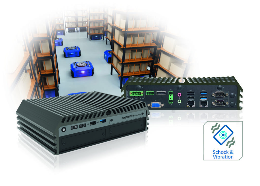 Die Box-PC-Serie PowerBox 600 von Spectra gibt es mit sechs verschiedenen i-Core-Prozessorvarianten der 9. Generation. Der leistungsfähigste Prozessor Intel Core i7-9700E mit acht Kernen erreicht 4,4GHz bei einer TDP von 65W. Der sparsamste Prozessor ist der Intel Core i3-9100TE mit vier Kernen und 3,2GHz bei 35W TDP. Als Arbeitsspeicher kommt ein 2666MHz-DDR4-SO-DIMM mit 32GB zum Einsatz. Weitere Speicheroptionen bieten ein 2.5“-SATA-Slot, zwei mSATA-Slots und ein m.2-2280m-Key-Sockel, der das NVMe-Protokoll unterstützt. Einsteckmodule für DisplayPort, HDMI, RS232/422/485, 16Bit-Digital-I/Os, USB3.2 Gen1 und LAN-Port sowie zwei Mini-PCIe-Slots, ein SIM-Karten-Steckplatz und ein m.2-2230-E-Key-Slot ehöhen die Individualisierbarkeit. Der integrierte UHD-Graphics-630-Grafikprozessor erlaubt die Anbindung von zwei unabhängigen Displays, welche über einen VGA-Port mit FullHD und einen DisplayPort mit 4K angeschlossen werden können.
