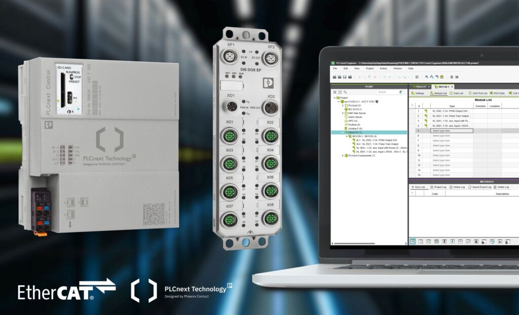 Bei Ethercat handelt es sich um ein etabliertes Echtzeit-Ethernet-Protokoll mit kurzen Zykluszeiten und hoher Synchronisationsgenauigkeit. Für das Ökosystem PLCnext Technology wird die Ethercat-Funktionalität über den PLCnext Store für den Anwender zur Verfügung gestellt. Der digitale Marktplatz von Phoenix Contact ist öffentlich zugänglich. Er umfasst eine Vielzahl von Apps, die speziell für Automatisierungslösungen entwickelt wurden. Anwender können dort Erweiterungen, Bibliotheken und Tools herunterladen, um ihre Steuerungen individuell anzupassen. Der Store wird kontinuierlich ausgebaut, sodass regelmäßig neue Funktionen und Applikationen erhältlich sind. Sie erstrecken sich von Übertragungsprotokollen bis zu branchenorientierten Lösungen. Anstatt aufwendige manuelle Konfigurationen vorzunehmen, können Anwender künftig die Ethercat-App installieren und sofort starten. Dies bedeutet, dass eine im Feld vorhandene Steuerung AXC F 3152 nach einem Firmware-Update und der Installation der App die Funktionalität auch nachträglich erhalten kann.