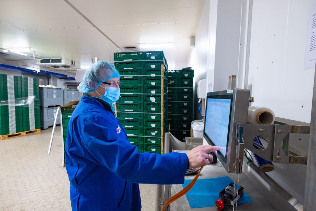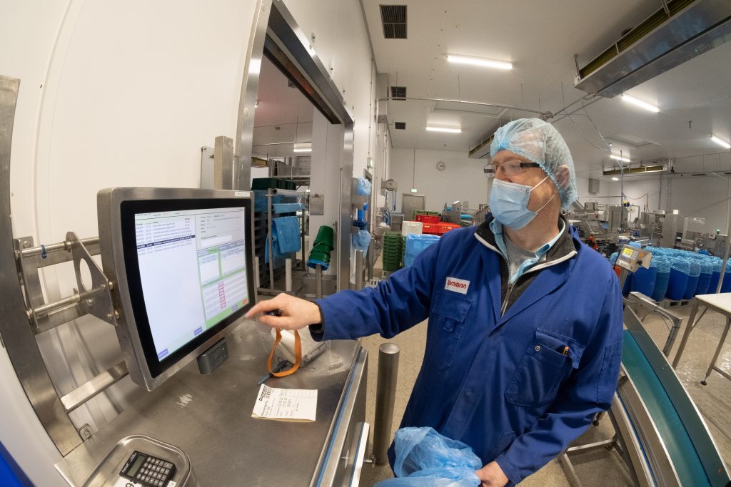 Hier gilt stets: Der Ablauf muss stimmen. So nutzt Düpmann für den Wareneingang, das Lagermanagement sowie die Produktion- und Auftragssteuerung räumlich verteilte Panel-PCs. Im Einsatz sind robuste Geräte aus der Vitam-9-Serie von Wachendorff. Die Edelstahlgehäuse der skalierten Produktfamilie sind vollständig geschlossen und verfügen über die Schutzart IP66/IP69K. In puncto Prozessor und Rechenleistung sind die Panel-PCs für komplexe und anspruchsvolle Anwendungen konzipiert. Für die Bedienung verzichtet Düpmann ganz bewusst auf abgesetzte Tastaturen. „Edelstahltastaturen kamen nicht in Frage. Sie sind teuer, nicht so robust und immer auch problematisch bei der Hygiene“, fasst Klimm zusammen. Stattdessen nutzt die Belegschaft den resistiven Touchscreen des 24″-Panel-PCs für die Eingabe. Das Ansprechverhalten per Druck macht dabei den Weg frei, die Handschuhe anzubehalten – was bei Düpmann aus Hygienegründen die Regel darstellt. Für die Nutzererkennung sind die Geräte mit einer RFID-Leseeinheit angebunden. Mitarbeiter müssen sich vor einer Eingabe per Chip-Key anmelden, damit im Zuge einer lückenlosen Produktnachverfolgbarkeit klar ist, wer wann in welchem Bereich am Panel stand.