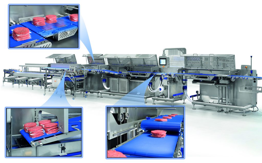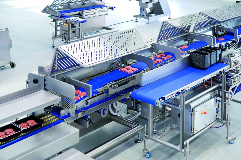 „Wir nehmen das Hackfleisch als Basis und am Ende wird daraus ein Burger, der anschließend gewogen, verpackt und markiert die Fabrik verlässt“, so Sleegers. „Dazwischen liegt eine Reihe von Arbeitsschritten.“ Oft findet man bei Produktionslinien spezielle Funktionsmodule am Anfang der Linie. Nachdem das Produkt portioniert, geformt und gewogen wurde, beginnen die ‚Underleavers‘ (Folien/Papier-Unterleger) und ‚Stackers‘ (Einheit zum Schichten einzelner Produkte) ihre Arbeit. In einem sogenannten ‚Lane Devider‘ werden die Burger in zwei Reihen unterteilt, um dann schön präsentiert in einem zuvor zugeführten Tray zu landen. Durch Sensoren erfolgen die Bewegungen exakt und schnell, die Servotechnik ist tief integriert. Dort wo Mitbewerber mit kleinen Motoren und viel Mechanik arbeiten, beeinflussen bei Sleegers an jeder Position, an der Bewegung benötigt wird, separate Servomotoren die Geschwindigkeit, Leistung und Position. Sleegers: „Unsere Maschinen sind zudem kompakt, wasserdicht und wir verbauen so wenig Kabel wie möglich.“ „Wegen der Wärmebrücke wird die Elektronik immer auf einer separaten Platte montiert, die nicht direkt mit dem äußeren Rahmen verbunden ist“, fügt van Beurden hinzu. Weil die Umgebungstemperatur sehr niedrig ist, die Maschine aber mit 80° heißem Wasser gereinigt wird, gibt es große Temperaturunterschiede und Kondensation im Schaltschrank. Deshalb kommt eine spezielle Abschirmung in der Maschine zum Einsatz. Die Schaltschranktüren haben doppelte Scharniere und auf der Oberseite der Maschine in Nähe des HMIs ist ein RJ45 Stecker zum Anschluss eines Laptops angebracht. So muss die Maschinentür so wenig wie möglich geöffnet werden.