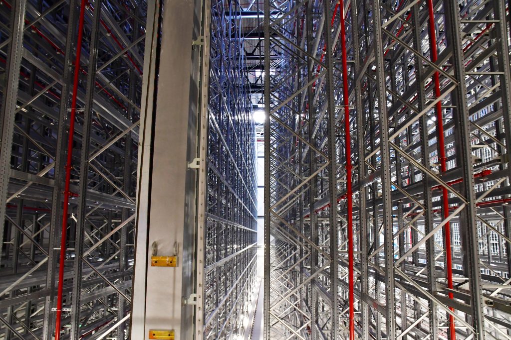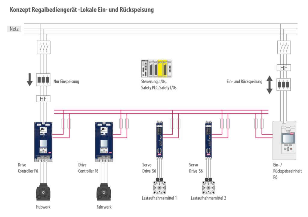 Auf die Lagerhaltung nimmt KEB mit seiner Technik keinen direkten Einfluss. Das Bindeglied zwischen Antriebstechnik und übergeordneter Steuerung kommt aber sehr wohl aus dem eigenen Portfolio. Es handelt sich um eine SPS vom Typ C6. Sie empfängt die Betriebsparameter sowie die nötigen Koordinaten aus dem Materialflussrechner via Profinet. Mit diesen Informationen berechnet sie die Fahrkurven und gibt diese Daten per Ethercat und FSoE an die Antriebstechnik im Feld weiter – die das RBG daraufhin präzise auf Position bringt.