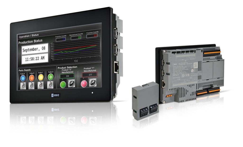 Mit der Serie FT2J bietet Apem/Idec eine platzsparende SPS mit integriertem Touchscreen an. Der I/O-Controller verbraucht etwa 40% weniger Strom als herkömmliche SPS-Display-Kombinationen. Durch den schmalen Rahmen kann ein vorhandenes 5,7″-Display durch ein 7″-Display ersetzt werden. Der Touchscreen des FT2J bietet einen großen Betrachtungswinkel, unterstützt Multitouch-Erkennung und ist mit Handschuhen bis zu einer Dicke von 1,5mm bedienbar. Das Glas-PCAP sorgt für hohe Sichtbarkeit, Beständigkeit und Funktionalität. Im Gegensatz zu herkömmlichen Produkten, die eine einzige CPU für HMI- und Steuerungsfunktionen verwenden, verfügt der FT2J über zwei parallel arbeitende CPUs. Die integrierte analoge E/A ermöglicht die Steuerung von Signalen von 0 bis 10VDC oder 4 bis 20mA mit 12Bit-Auflösung. Für präzise Anwendungen wie Temperatur-, Durchfluss- oder Druckregelung steht ein PID-Algorithmus mit Kaskadenregelung zur Verfügung.