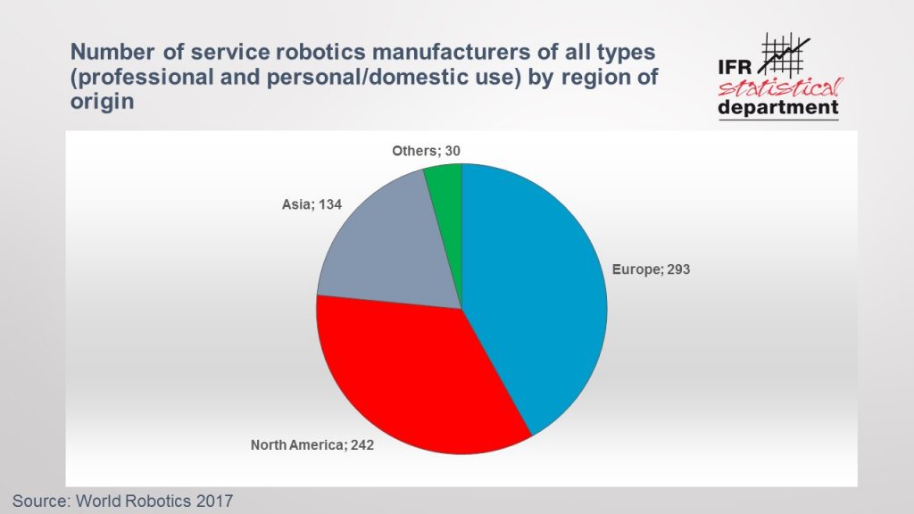 Der Umsatz mit Servicerobotern für den professionellen Einsatz soll bis Ende 2017 um 12% auf einen neuen Rekordumsatz von 5,2Mrd.US$ steigen. Das sind Ergebnisse aus dem World-Robotics-Report 2017 für Service Robots der International Federation of Robotics (IFR). Auch die weitere Prognose ist positiv: Im Zeitraum 2018 bis 2020 wird ein durchschnittliches Wachstum von 20 bis 25% erwartet. „Bei der Umsatzprognose 2018 bis 2020 erwarten wir für das Professional-Service-Segment ein kumuliertes Volumen von rund 27Mrd.US$“, sagt Gudrun Litzenberger, Generalsekretärin der IFR. „Roboter für Medizin, Logistik und Field-Services sind dabei die wichtigsten Wachstumstreiber.“ Gleichzeitig entwickelt sich auch der Markt für Personal-Serviceroboter, die den Menschen im Alltag unterstützen, rasant: Der Umsatz mit Robotern für häusliche Aufgaben aller Art erreicht einen geschätzten Wert von rund 11Mrd.US$ (2018 bis 2020). „Das wachsende Interesse an Servicerobotik ist teilweise auf die Vielfalt und Anzahl von Start-ups zurückzuführen, die derzeit 29% aller Roboterunternehmen ausmachen“, sagt Martin Hägele von der IFR Service Robot Group. Rund 290 der 700 registrierten Anbieter von Servicerobotern kommen aus Europa. Nordamerika liegt mit rund 240 Herstellern auf Platz zwei und Asien mit rund 130 Herstellern auf Platz drei. In den USA arbeiten derzeit rund 200 Start-ups an neuen Servicerobotern. In der Europäischen Union und der Schweiz sind 170 Firmen aktiv, die eine neue unternehmerische Kultur für die Servicerobotik schaffen – gefolgt von Asien (135).