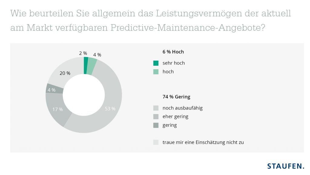 Drei Viertel der deutschen Industrieunternehmen sind von Predictive Maintenance nicht überzeugt. Deren Leistungsvermögen sei gering oder zumindest noch ausbaufähig. Nur 6% sehen derzeit einen großen Nutzen in der vorausschauenden Instandhaltung auf der Grundlage von Prozess- und Maschinendaten. Das sind Ergebnisse des bereits zum vierten Mal erhobenen Deutschen-Industrie-4.0-Index. Im Auftrag der Unternehmensberatung Staufen wurden rund 400 Industrieunternehmen in Deutschland befragt. Damit findet gerade eines der oft angeführten Paradebeispiele für bereits in der Praxis umgesetzte Industrie-4.0-Lösungen erstaunlich geringe Zustimmung. Zumal zwei Drittel der Unternehmen angeben, das Prinzip im eigenen Haus schon zu nutzen oder als Dienstleistung anzubieten. Der Anteil der Befragten, die sich keine Bewertung zutrauen, ist mit 20% auffallend hoch. Thomas Rohrbach, Geschäftsführer der Staufen Digital Neonex, ist der Meinung, dass viel zu häufig die Begrifflichkeiten aus dem Baukasten der digitalen Transformation als Worthülse für Altbekanntes gebrauch werden. Der Übergang von der einfachen Fernwartung und Condition Monitoring zu Predictive Maintenance-Lösungen ist fließend. Doch erst, wenn Anwender einen echten Mehrwert erfahren, wird das Prinzip nachhaltig überzeugen.