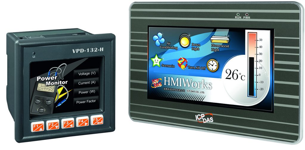 Mit der VPD-Serie von ICPDAS lässt sich eine kompakte zentrale Funktionseinheit für Kleinanlagen, Geräte und Automaten realisieren. Eine Erweiterung mit analogen und digitalen I/Os ist über die XV-Erweiterungs-Boards möglich. Die HMI-Systeme werden mit der kostenfreien Entwicklungssoftware HMIWorks ausgeliefert. Sie bietet eine benutzerfreundliche Gestaltung der webbasierten Oberfläche für die Visualisierung. Die Steuerungsaufgaben lassen sich über die Soft-SPS-Funktion mit den beiden alternativen Programmiersprachen Ladder-Design für SPS-Anwender und C-Programmiersprache für IT-Anwender realisieren. Mit dem Softwarepaket erstellen Anwender ein HMI-System mit Steuerungsintelligenz. Der integrierte 32Bit-Risc-Prozessor sorgt zusammen mit Schnittstellen wie Ethernet, RS485 und RS232 sowie mit dem ModbusTCP/RTU-Protokoll für den Datenaustausch.