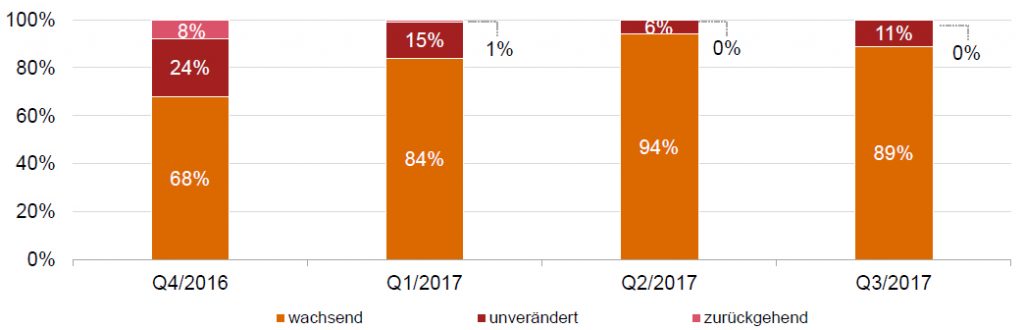 Aktuell sehen neun von zehn Maschinenbauer die deutsche Wirtschaft auf Wachstumskurs. Von einer auch weiterhin positiven konjunkturellen Entwicklung in den kommenden zwölf Monaten gehen 80 Prozent der befragten Entscheider aus. Im Hinblick auf die Weltwirtschaft erreicht die Stimmung in der Branche sogar neue Bestmarken: Die aktuelle Situation bewerten 73 Prozent der Maschinenbauer positiv (Vorquartal: 65 Prozent). Mehr als die Hälfte (52 Prozent) blickt zudem optimistisch auf die globale Konjunkturentwicklung in den nächsten zwölf Monaten (Vorquartal: 49 Prozent).