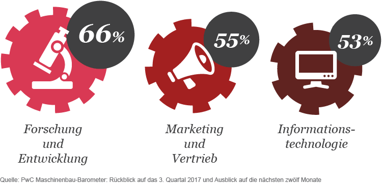 Die exzellente Stimmung im deutschen Maschinenbau spiegelt sich auch in den Umsatzprognosen der Entscheider wider. Im 3. Quartal sind die Erwartungen an das Wachstum der Branche im laufenden Jahr noch einmal deutlich gestiegen: Gingen die Befragten Mitte des Jahres noch von einer Umsatzsteigerung von 3,9 Prozent im Jahresvergleich aus, erwarten sie für 2017 nun ein Plus von durchschnittlich 5,6 Prozent – der höchste Wert seit Beginn der Erhebung. Die Entwicklung des eigenen Unternehmens in den nächsten zwölf Monaten schätzen die Maschinenbauer traditionell sogar noch stärker ein. Im Schnitt erwarten sie eine Umsatzsteigerung von 6,6 Prozent. „Die ungebrochen hohe Auslastung der Unternehmen sowie sehr positive Umsatzerwartungen sorgen für gute Stimmung in der Branche“, sagt Dr. Frank Schmidt, Partner und Leiter des Bereiches Industrielle Produktion bei PWC. „Besonders erfreulich ist, dass viele Maschinenbauer die gute Lage für den Ausbau der eigenen Investitionstätigkeit nutzen wollen.“ Tatsächlich planen 60 Prozent der Maschinenbauer in den kommenden zwölf Monaten größere Investitionen. Durchschnittlich wollen die Unternehmen neun Prozent ihres Gesamtumsatzes für Investitionsvorhaben aufwenden. „Vor allem sollen die Bereiche Forschung und Entwicklung sowie Marketing und Vertrieb von den Ausgabenerhöhungen profitieren“, so PWC-Experte Schmidt.