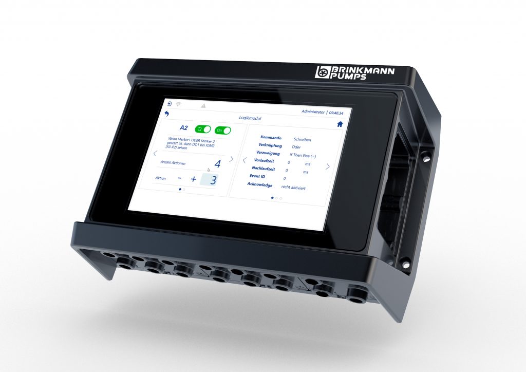 Die intelligente Pumpensteuerung BPLogic von Brinkmann Pumps wird zwischen Werkzeugmaschinen, Pumpen, Filteranlagen und anderen Komponenten geschaltet und integriert sich unabhängig von den eingesetzten Frequenzumrichtern in bestehende Systemumgebungen. Der digitale Controller kann z.B. den Verschleißgrad von Pumpen ermitteln und Laufzeiten ableiten. Die Konfiguration erfolgt über die Benutzeroberfläche der intelligenten Pumpensteuerung. Dort können alle verfügbaren Größen wie Drücke, Drehzahlen sowie weitere digitale und analoge Ein- oder Ausgangssignale logisch miteinander verknüpft werden. Die Implementierung von Zeitgliedern ist ebenso möglich wie die Ausgabe kundenspezifischer Fehlermeldungen in verschiedenen Sprachen. Der implementierte Online-Debugger unterstützt die Fehlersuche bei der Überprüfung herstellerspezifischer Funktionen. Neu erstellte Funktionen werden direkt auf der Steuerung gespeichert. Anpassungen können jederzeit vorgenommen werden. Die Implementierung eigener Funktionen in vorhandene Systeme erfolgt innerhalb kurzer Zeit. So sollen Anlagen aufgewertet und zukunftssicher auf neue Anforderungen vorbereitet sowie Handlungsspielräume vergrößert werden.