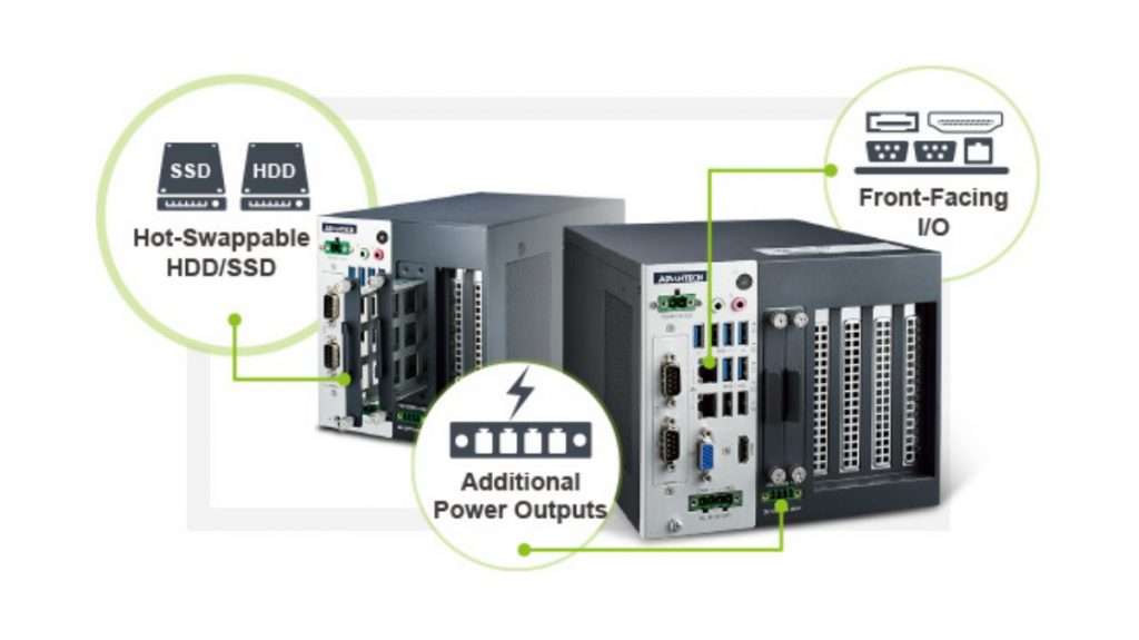 Die Industrierechner IPC-220 und IPC-240 von Advantech sind lüfterlos und mit 140x230x150mm kompakt ausgeführt. Die Intel-Core-i-Prozessoren der 6. bzw. 7. Generation sind gut geeignet für anspruchsvolle Maschinensteuerungs- und Bildverarbeitungsanwendungen. Die IPCs sind für den Einsatz in rauen Industrieumgebungen, sowie für Schaltschrankinstallationen mit begrenztem Platzangebot konzipiert. Mit zwei bzw. vier PCIe/PCI-Steckplätzen für die Integration von Zusatzkarten und kompatibel mit Windows-7/10-Betriebssystemen, sind die Geräte für traditionelle Steuerungsaufgaben und industrielle Automatisierungsanwendungen geeignet. Alle Ports und Anschlüsse (2x GigaLAN, 6x USB3.0, 2x USB2.0, 2x serielle Ports, Audio-In, HDMI, VGA) sind frontseitig platziert und erleichtern den Zugriff, besonders bei begrenztem Platzangebot.