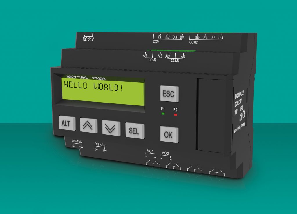 Die kompakte SPS PR200 von Akytec ist ausgestattet mit einem LCD-Display, sechs Funktionstasten, einer Echtzeituhr und auf Wunsch zwei RS485-Schnittstellen. Die Kleinsteuerung für die Hutschiene ist in verschiedenen Varianten für Gleich- und Wechselspannung, mit nur digitalen oder einer Kombination aus digitalen und analogen I/Os erhältlich. Der Arbeitstemperaturbereich liegt bei –20 bis +55°C. Die Programmierung der SPS erfolgt über die kostenlos mitgelieferten Software ALP in FBS.