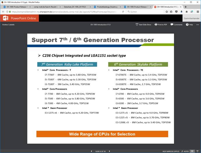 Der lüfterfreie Box-PC DX-1000 von Comp-Mall besitzt skalierbare Erweiterungen über optionale integrierte Module für Schnittstellen, Funktionen und eine breite Palette an Prozessoren. Darüber hinaus verfügt er über kompakte Abmessungen und ist mit einer Grundfläche von ca. 0,04m2 für den Einbau in beengter Umgebung geeignet. Basierend auf dem Sockel LGA1151 lassen sich Intel-Prozessoren der sechsten und siebten Generation verbauen. Verwendet wird der C236-Chipsatz und 2xDDR4 260-pin-SO-Dimm-Sockel. Die Erweiterungen von vier full-size-Mini-PCIe-Steckplätzen sowie vier Slots für die Cincoze-CMI&CFM-Module bietet eine hohe Skalierbarkeit. Mit den vielseitigen Vernetzungsmöglichkeiten, der hohen Rechenleistung und den zahlreichen Schnittstellen besitzt die kompakte und robuste Embedded Workstation gute Voraussetzungen für das Internet der Dinge und für die Verwendung als intelligenter Control Server. Der Box-PC ermöglicht bis zu zehn GLAN-Schnittstellen. Aufgrund des Designs als Embedded Workstation in kompakter Bauweise und der anwendungsorientierten Ausrichtung über die vielseitigen Erweiterungen finden sich Einsatzbereiche in der Maschinensteuerung, Automatisierungstechnik, Robotik, Bildverarbeitung, Montage, im mobilen Einsatz, in der Handhabungstechnik und auch im Gebäudemanagement.