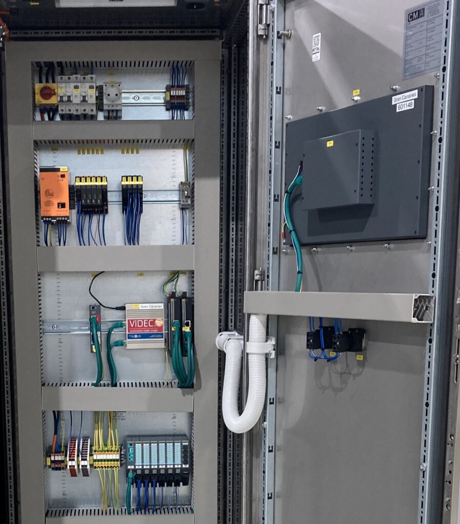 Die Bedienung und Visualisierung des Systems erfolgt mittels eines 15,6″-Insevis-Touchpanels HMI1560T. Ein S7-IIoT-Gateway GC300T von Insevis übernimmt die Konvertierung des RFC1006-Protokolls (S7-Kommunikation) auf OPC UA Server. Um einen Datenverlust zu vermeiden, erfolgt eine lokale Zwischenspeicherung mittels eines June5 Gateways der Firma Videc. Die Messwertübertragung zum Acron Archiv-Server geschieht mittels des MQTT-Protokolls. Der Archivserver wird in der Cloud betrieben und durch CM-Automation in Zusammenarbeit mit der IFCO IT administriert, die diesen wiederum als Datenquelle für weitere statistische Auswertungen und Abrechnungen nutzt. Die Fernwartung aller eingesetzten Komponenten erfolgt über das von CM-Automation betriebene Fernwartungsportal CMA-Cloud. Die Programmierstation wird hierzu ebenfalls in der Cloud gehostet.