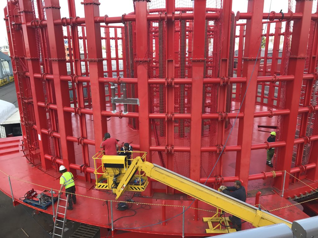 Bei allem steht der Schutz des Bedieners im Mittelpunkt. Van Wijk macht deutlich: „Schließlich sind hier Menschen am Werk und da passieren eben Fehler.“ Z.B. wenn sich Personen während des Betriebs im Gefahrenbereich des Kabelkarussells aufhalten. Eine regelmäßige Wartung und Grundüberholung der Kabelkarusselle ist also Standard. Im vergangenen Jahr stand so auch eine Grundüberholung für das erste, 2012 in Betrieb genommene Kabelkarussell an – es verfügt über ein Leergewicht von 600t und einen Durchmesser von 23m sowie eine Kapazität von bis zu max. 5.000t, die es aufnehmen kann. Die Wartung umfasste neben dem Austausch von Verschleißteilen wie Hydraulikschläuchen oder einem neuen Anstrich auch eine Reihe kundenspezifischer Verbesserungen: Die Kapazität der Spannvorrichtung wurde von 5 auf 15t erweitert und das Steuerungssystem auf den aktuellen Stand der Technik gebracht. Zudem kann man das Kabelkarussell mit Blick auf die Sicherheit des Bedieners seit dem Retrofit ausschließlich von der Bedienerkabine aus steuern. Im Problemfall kommen die Decksysteme zu einem sofortigen Stopp und das Steuerungssystem zeigt die Störung konkret an, damit sie schnell und effizient behoben werden kann.