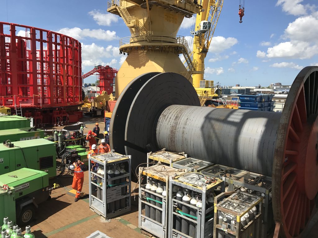 Das erste Kabelkarussell von Blue Offshore ging 2012 in Betrieb. Doch kein Projekt gleicht seitdem dem anderen: „Leitungen und Elektrokabel auf dem Meeresboden zu verlegen, ist jedes Mal wieder anders, sogar einzigartig“, schaut van Wijk zurück. Denn die geologische Beschaffenheit des Meeresgrundes und weitere Faktoren bestimmen, wie groß, wie leistungsstark und wie schnell die Deckausrüstung sein muss. Und der Meeresboden ist nun mal so unterschiedlich beschaffen wie die übrige Erdoberfläche. Aus diesem Grund ist es wichtig, dass die Systemkomponenten je nach Anforderung zusammengestellt werden können, damit unterschiedliche Kundenanforderungen bedient werden können. Größe, Leistungsstärke und Schnelligkeit der Deckausrüstung variieren so von Projekt zu Projekt. Die jeweils benötigten Komponenten werden am Dock auf einem dafür vorgesehenen Schiff installiert und im Anschluss mit den Leitungen bzw. Kabeln beladen. Das so ausgestattete Schiff macht sich anschließend auf den Weg zur Verlegestelle auf See, wo es angekoppelt wird. Sämtliche Leitungen werden anschließend per Kabelkarussell über die Spannvorrichtung zur Plattform, Verteilereinrichtung oder Windenergieanlage verlegt. Dabei sorgt ein elektrohydraulischer Motor nicht nur für den Antrieb des Kabelkarussells, sondern auch für die Führung der Leitungen oder Kabel beim Einholen bzw. späteren Abwickeln.